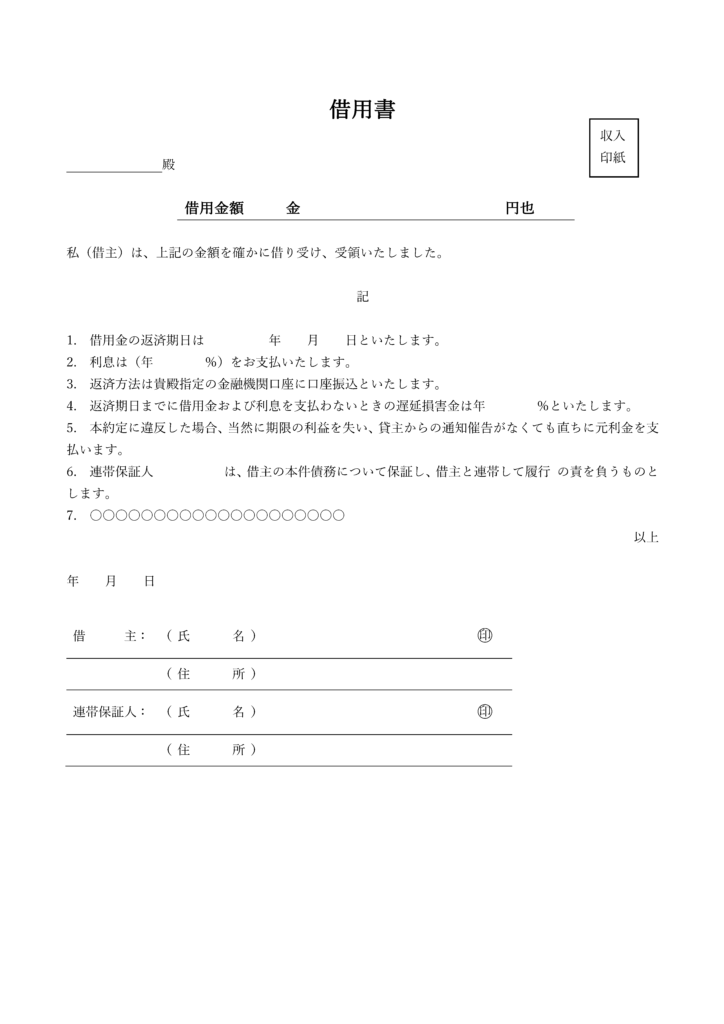 - 契約当事者: 貸し手(債権者)と借り手(債務者)の名前と署名が必要です。