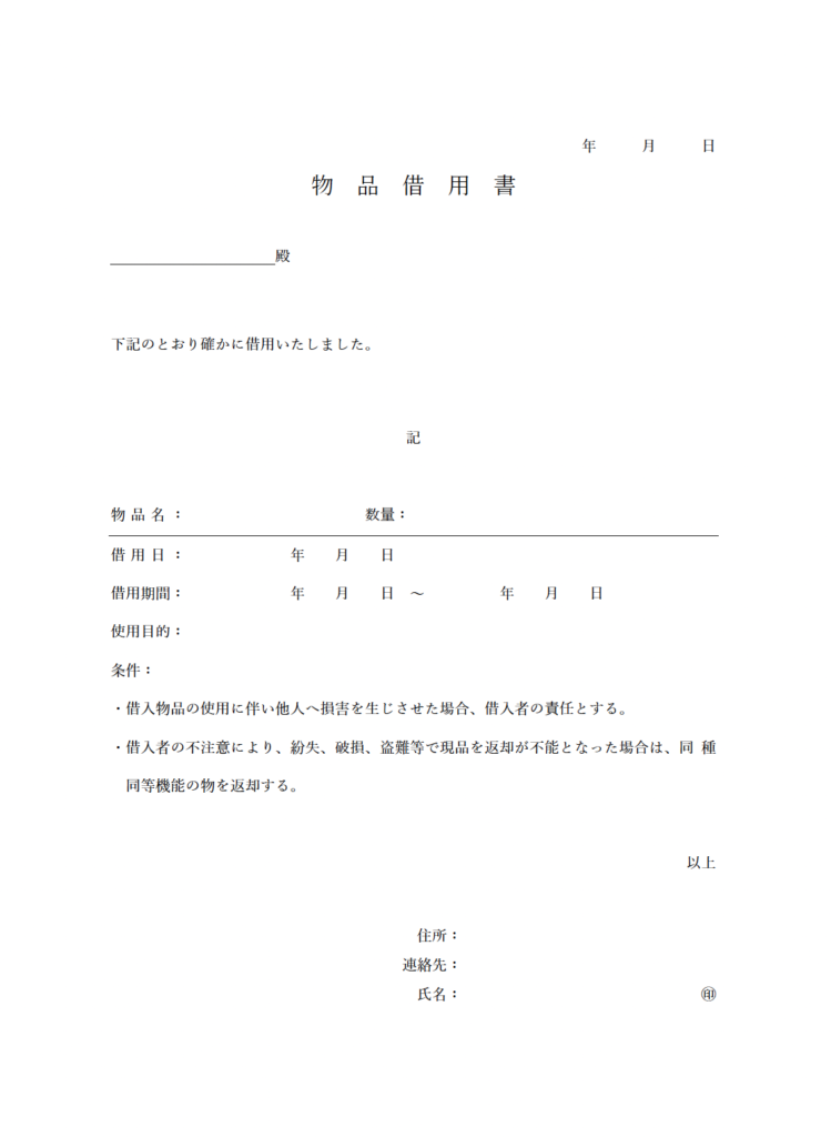 この借用書は、物品の貸し借りに関する合意が正式に行われ、両者の権利と義務が明記されていることを保証します。また、後日の争いを防ぐための記録として機能します。