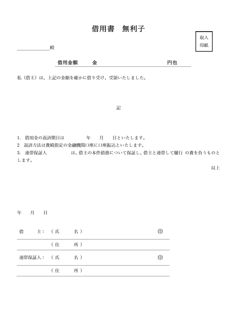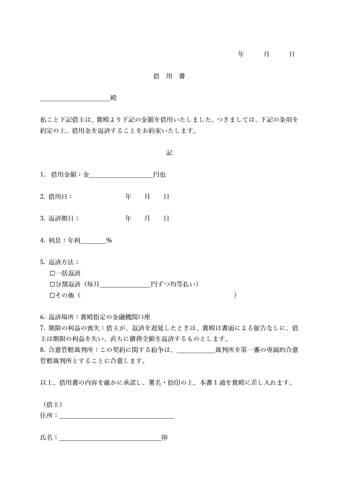 家族間であっても金銭の貸し借りを明確にし、将来的な誤解や争いを避けるために有効です。家族間であっても法的な効力を持たせるために、返済に関する具体的な条件を書面に記すことが推奨されます。借用書は、貸し手と借り手双方の合意の下で署名され、必要に応じて法的証拠として使用されることがあります。